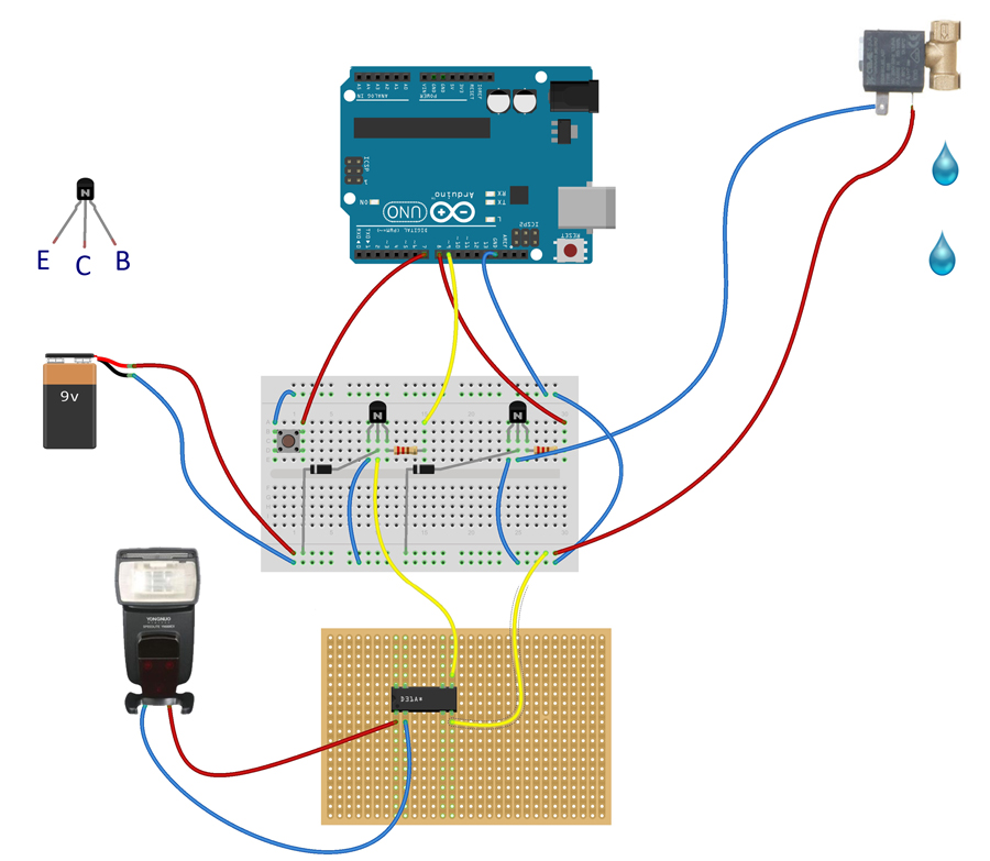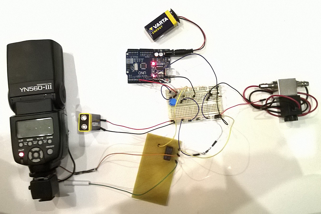 Drugie wyjscie uC albo tak samo albo dla bezpieczenstwa przez optoizolator. Zamiast diody i zaworu, lampa blyskowa.